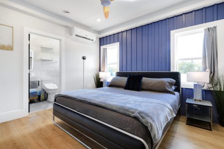 • Fourth bedroom: Second floor, king-sized bed, smart TV, bedside table + lamp, electric fireplace, full-length mirror, walk-in closet + ensuite bathroom
