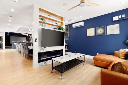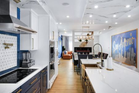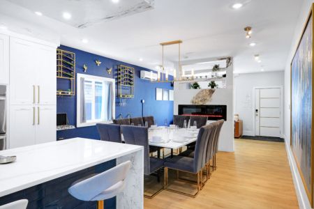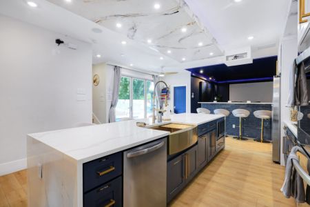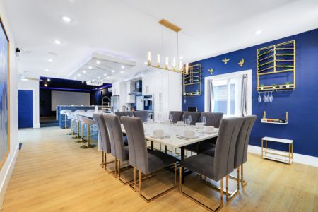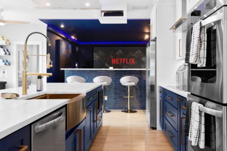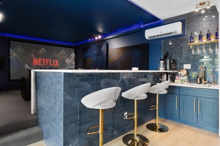 • Shared kitchen island between movie theater and kitchen + coffee bar/bar