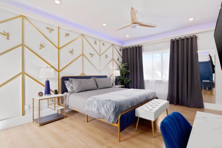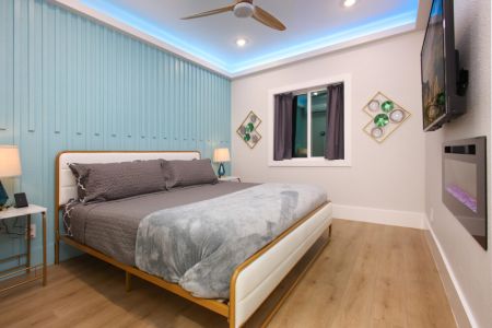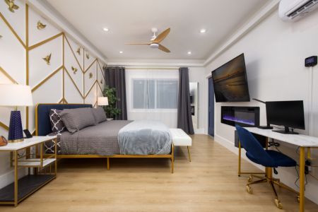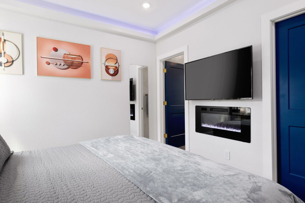 • Fifth bedroom: Second floor, king-sized bed, smart TV, bedside table + lamp, electric fireplace, full-length mirror, walk-in closet + ensuite bathroom