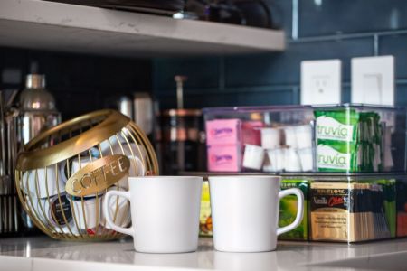 • Keurig coffee machine + drip coffee machine + French press with complimentary coffee pods, coffee, tea, sugar, cream, and sweetener