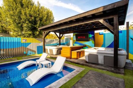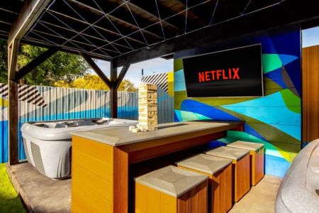 • Pergola w/ 2 hot tubs + bar table, bar stools + large smart TV