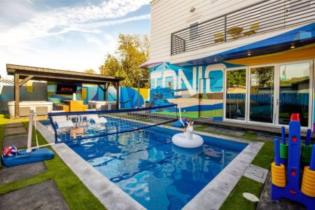 • Games galore; pool volleyball net + pool basketball hoop + giant Jenga, giant Connect 4 + poker set + board games + cornhole set