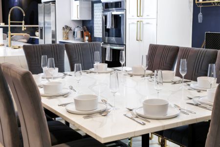 • Fully stocked chef’s kitchen w/ stainless steel appliances (including refrigerator/freezer w/ in-built water + ice dispenser)
