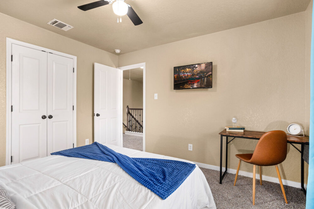 • Fourth bedroom: Second floor, queen-sized bed, smart TV, desk + chair, bedside table + lamp, closet