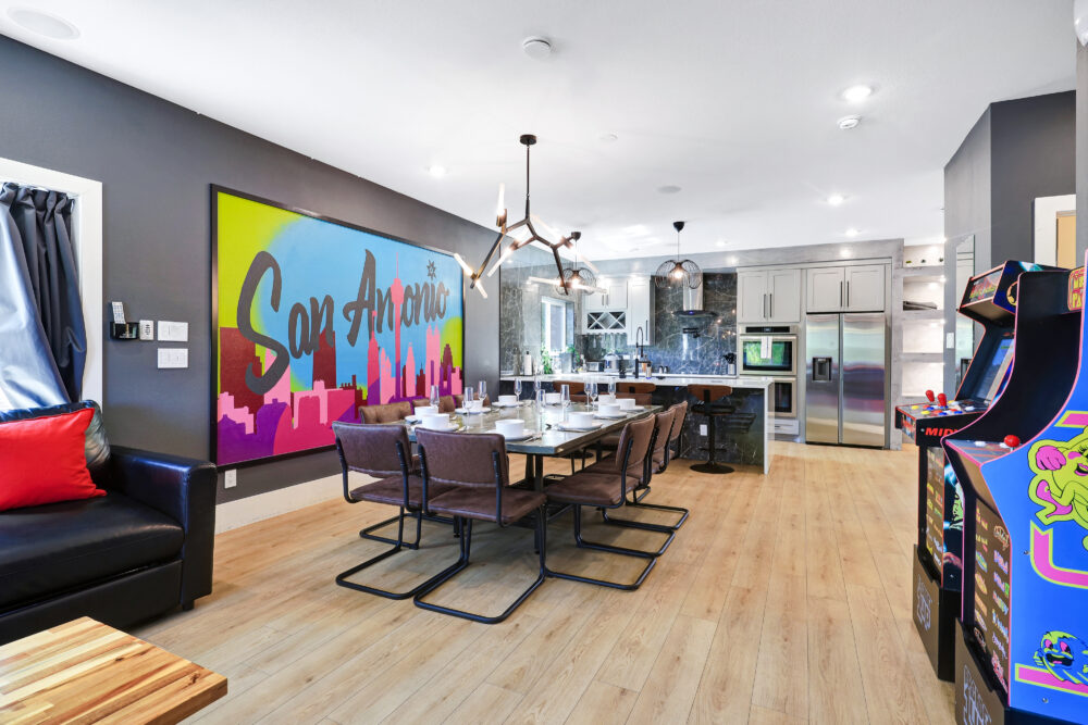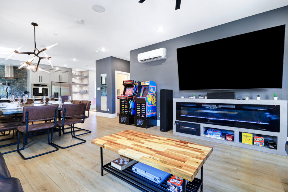 • Living room w/ arcade machines (Mortal Kombat, Pac Man & much more!) + electric fireplace + big sectional sofa + smart TV