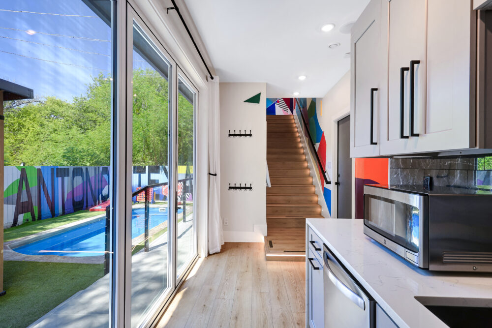• Fully stocked chef’s kitchen (2nd floor) & kitchenette (1st floor, near pool area) w/ stainless steel appliances (including refrigerator/freezer w/ in-built water + ice dispenser)