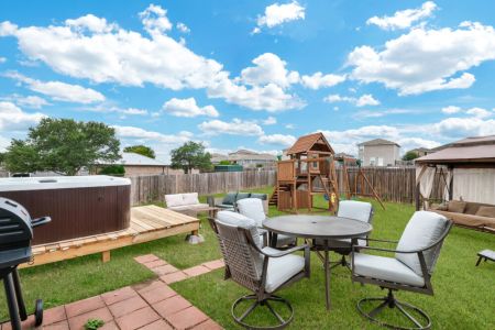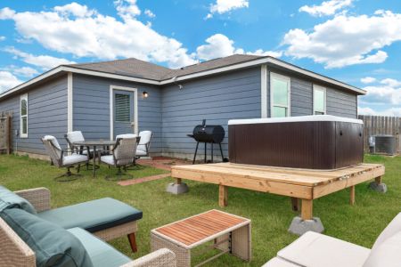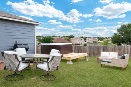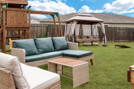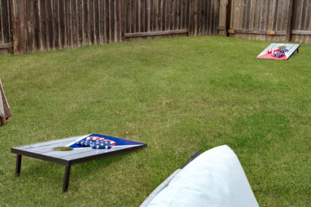 • Private large backyard w/ outdoor lounge furniture + patio swing bench + table and 4 chairs + cornhole set