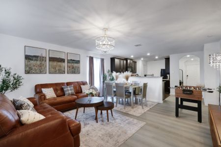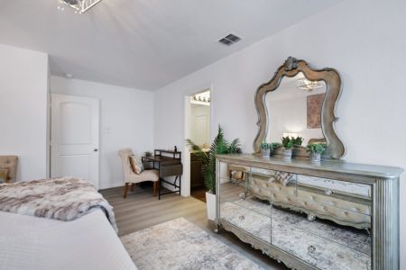• Primary bedroom: King-sized bed, desk + chair + accent chair, bedside table + lamp, walk-in closet + dresser + ensuite bathroom