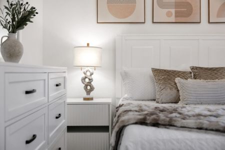 • Third bedroom: Queen-sized bed, bedside table + lamp, closet + dresser + bed frame storage drawers