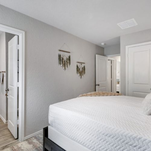 • Primary bedroom: Queen-sized bed, bedside table + lamp, walk-in closet + dresser + ensuite bathroom + direct access to backyard