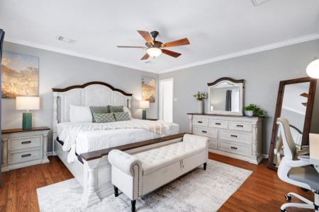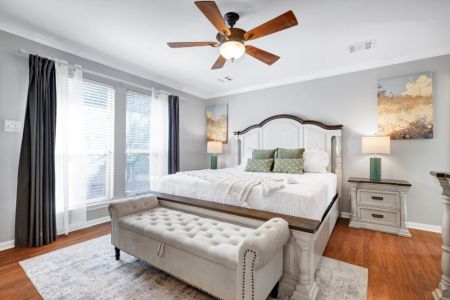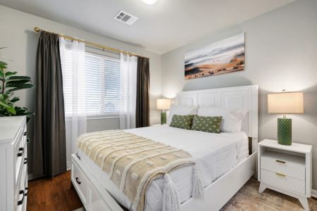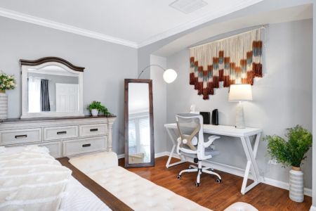 • Primary bedroom: King-sized bed, desk + ergonomic chair, sofa bench, bedside table + lamp, full-length mirror, walk-in closet + dresser + ensuite bathroom, direct access to backyard