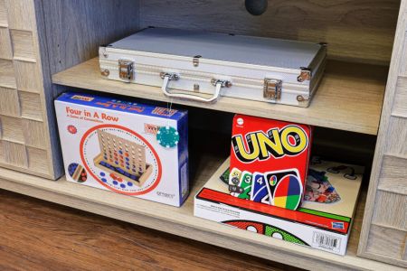 • Selection of board games + poker set + cornhole set