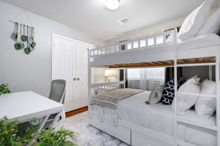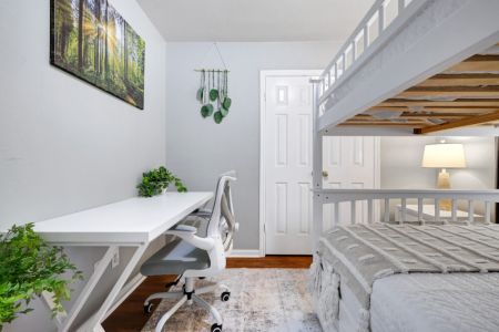 • Third bedroom: 2 full-sized beds (bunk bed), desk + ergonomic chair, bedside table + lamp, closet