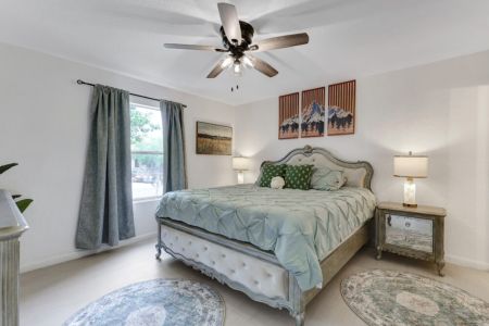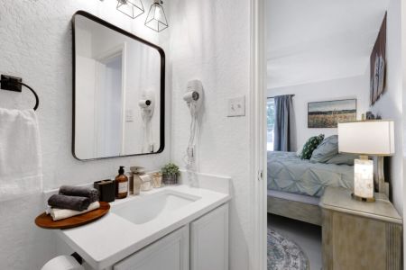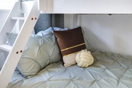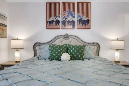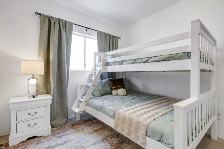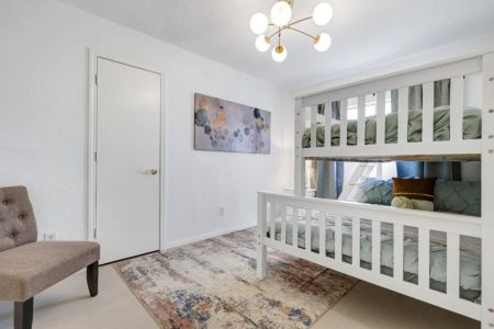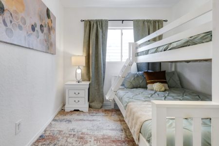 • Fourth bedroom: Full-sized bed and twin-sized bed (bunk bed), accent chair, bedside table + lamp, walk-in closet