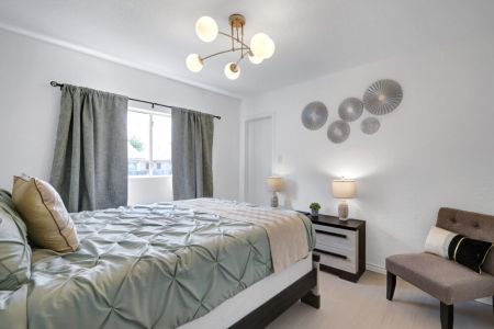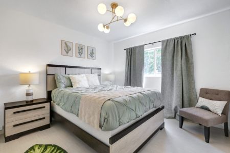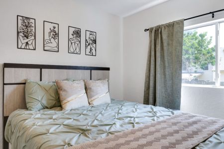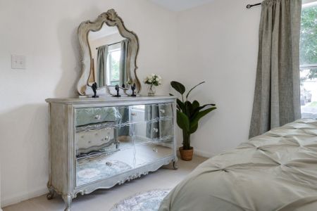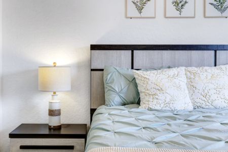 • Third bedroom: Queen-sized bed, accent chair, bedside table + lamp, walk-in closet + dresser