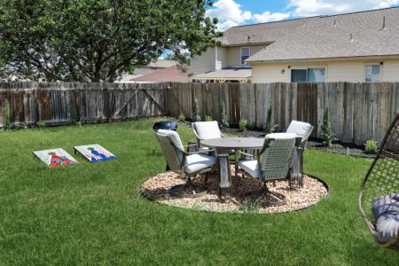 • Private large backyard and covered patio w/ hanging egg chair + table and 4 chairs + cornhole set