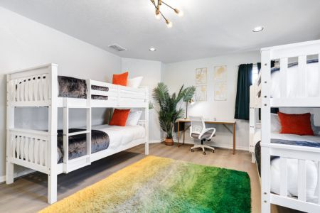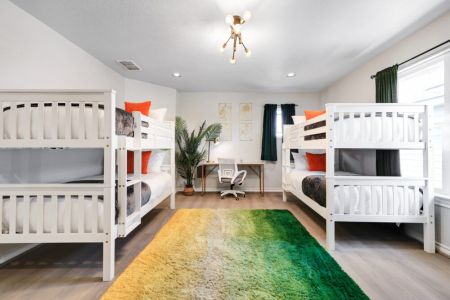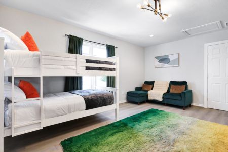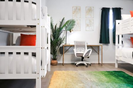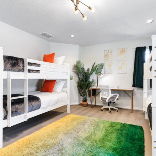 • Fifth bedroom: 4 twin-sized beds (bunk beds), desk + ergonomic chair, sectional sofa, dresser