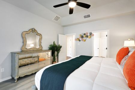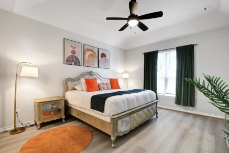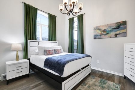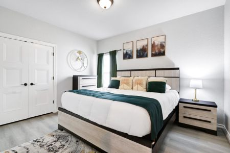 • Primary bedroom: King-sized bed, bedside table + lamp, walk-in closet + dresser + ensuite bathroom