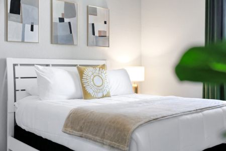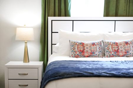 • Second bedroom: King-sized bed, bedside table + lamp, closet + dresser