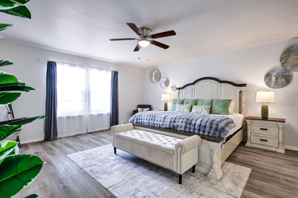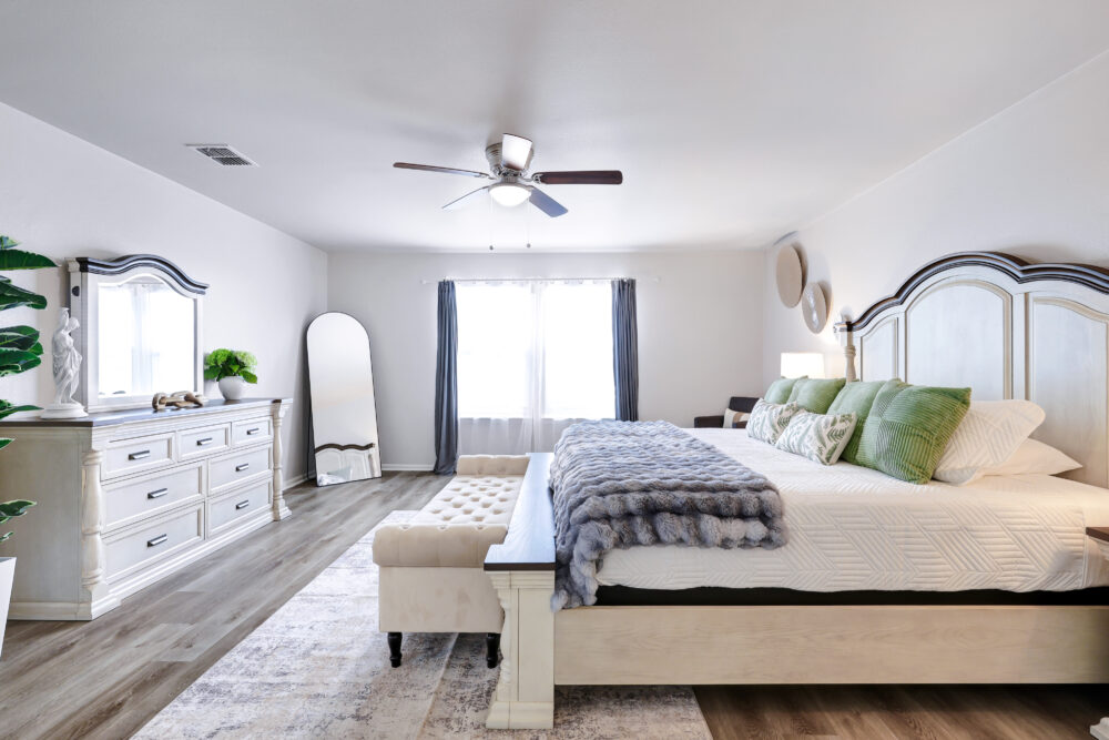 • Primary bedroom: First floor, king-sized bed, bench + accent chair, bedside table + lamp, full-length mirror, walk-in closet + ensuite bathroom