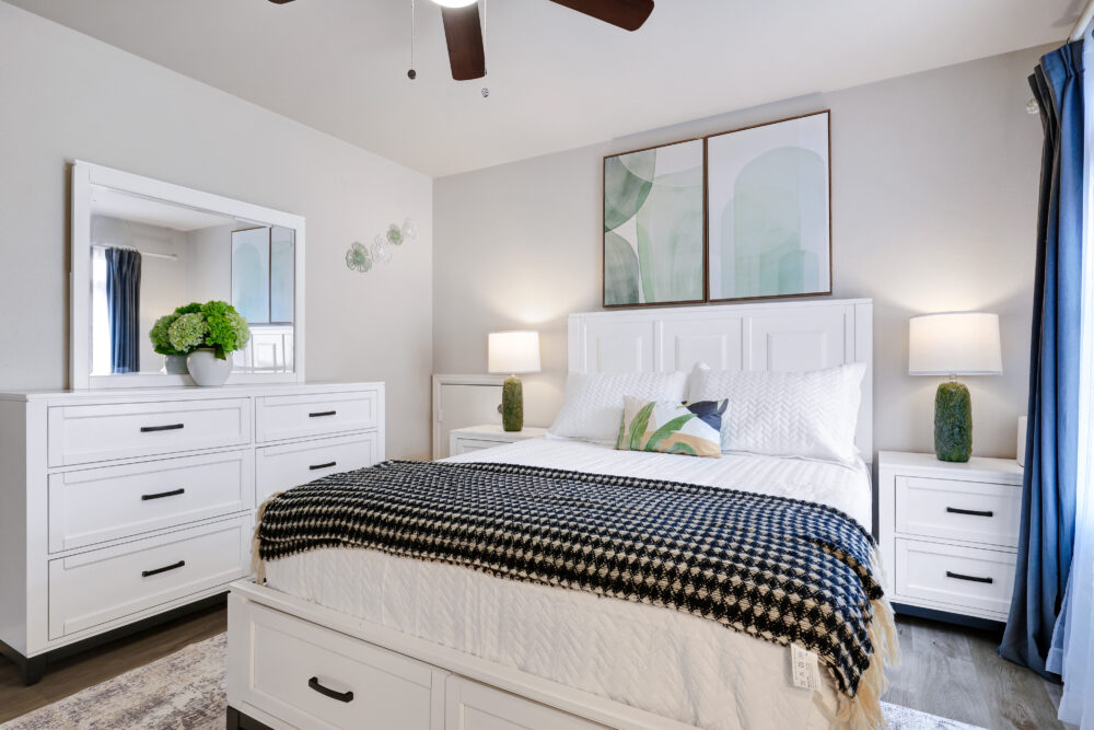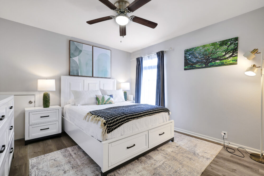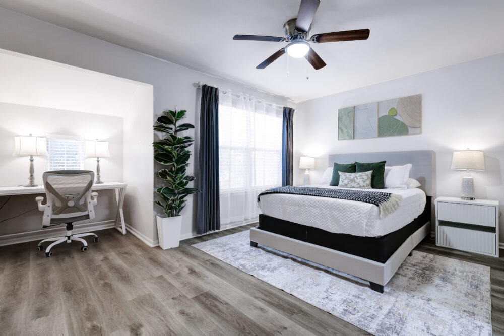• Second bedroom: Second floor, queen-sized bed, desk + chair, bedside table + lamp, walk-in closet