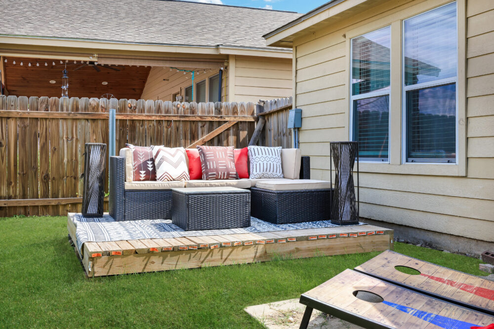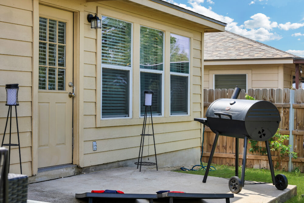 • Private backyard w/ spacious lawn + charcoal BBQ grill + patio seating + table and chairs + cornhole set
