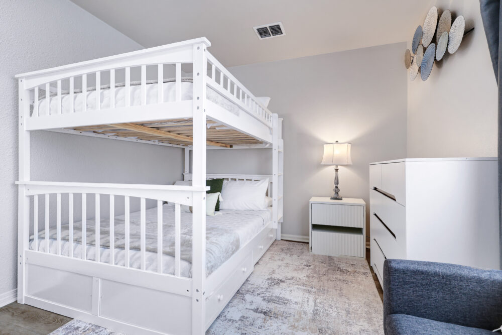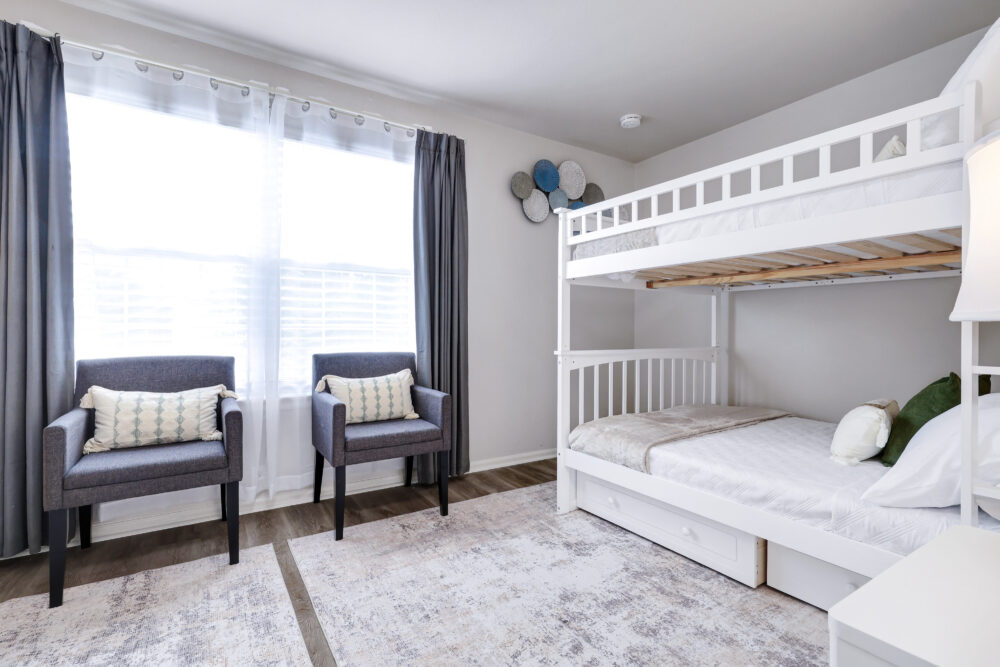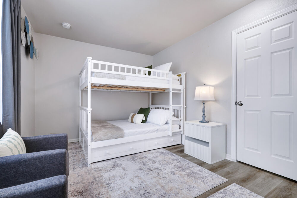 • Fifth bedroom: Second floor, 4 full-sized beds (2 bunk beds), 2 accent chairs, bedside table + lamp, dresser