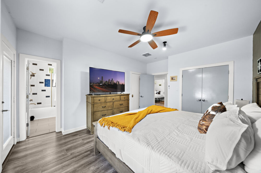 • Primary bedroom: Second floor, king-sized bed, smart TV, bedside table + lamp, closet + dresser + ensuite bathroom + balcony w/seating area