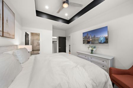• Primary bedroom: Second floor, king-sized bed, smart TV, bedside table + lamp, full-length mirror, walk-in closet + dresser + accent chair + ensuite bathroom