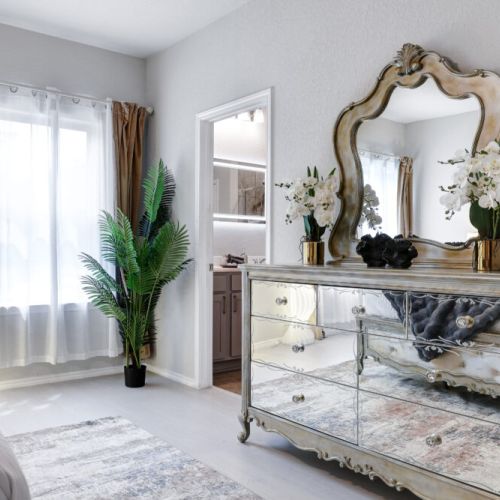 • Primary bedroom: King-sized bed, bedside table + lamp, walk-in closet + dresser + ensuite bathroom