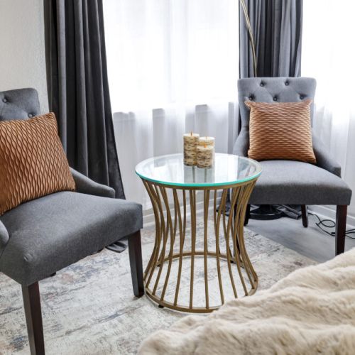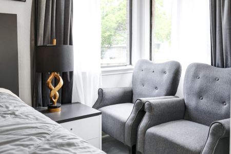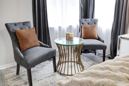 • Second bedroom: Queen-sized bed, 2 accent chairs, bedside table + lamp, closet + dresser