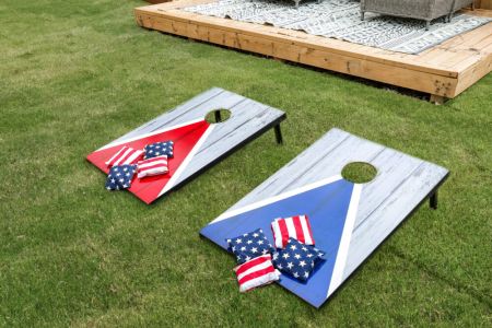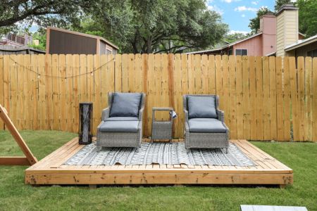 • Private backyard w/ spacious lawn + charcoal BBQ grill, patio seating + table and 2 chairs + cornhole set