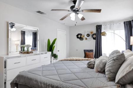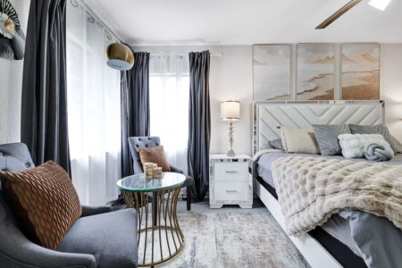 • Primary bedroom: King-sized bed, bench, 2 accent chairs, bedside table + lamp, walk-in closet + dresser + ensuite bathroom