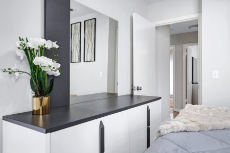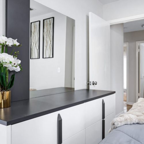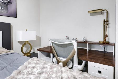 • Third bedroom: Queen-sized bed, desk + ergonomic chair, accent chair, bedside table + lamp, dresser