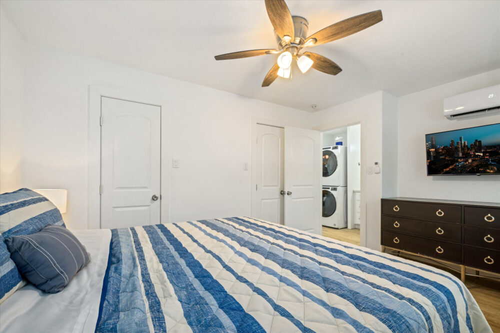 • Primary bedroom: King-sized bed, smart TV, bedside table + lamp, 2 closets + dresser