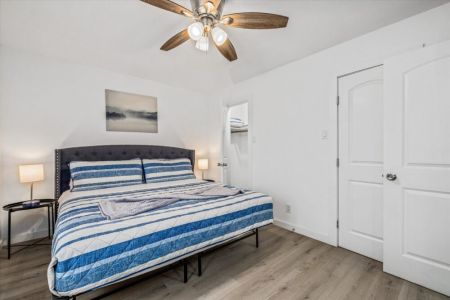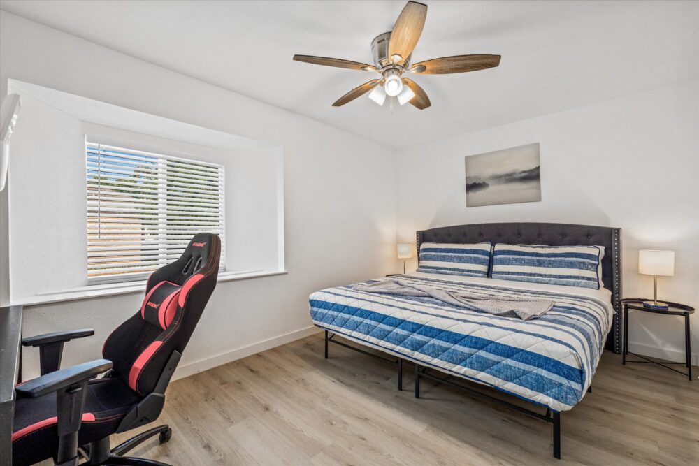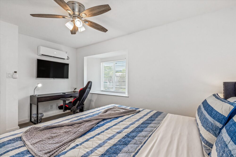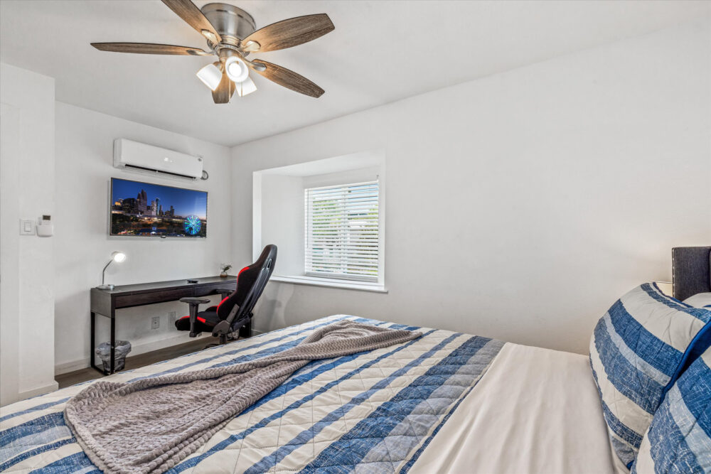 • Primary bedroom: King-sized bed, smart TV, desk + gaming chair, bedside table + lamp, 2 closets
