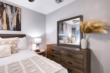 • Primary bedroom: King-sized bed, desk + ergonomic chair, bench, bedside table + lamp, walk-in closet + dresser + ensuite bathroom