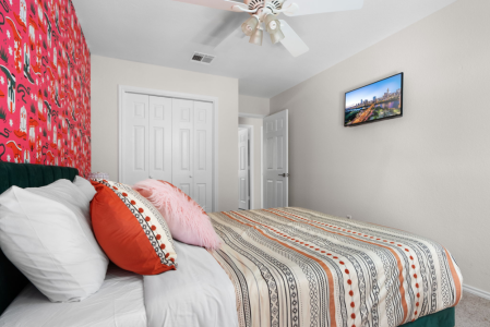 • Second bedroom: Second floor, queen-sized bed, smart TV, bedside table + lamp, closet + dresser