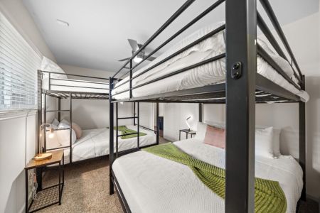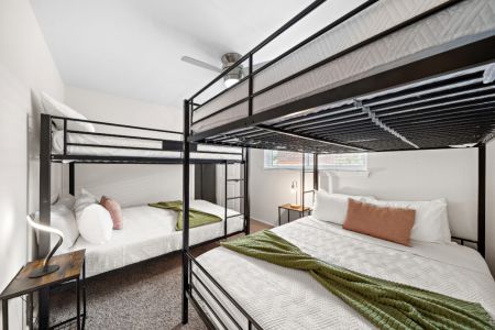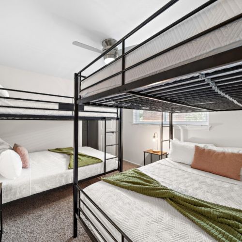 • Third bedroom: 4 queen-sized beds (2 bunk beds), bedside table + lamp, walk-in closet