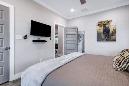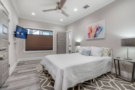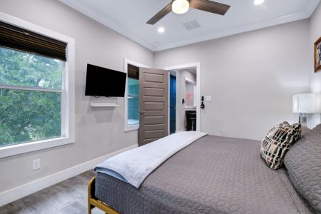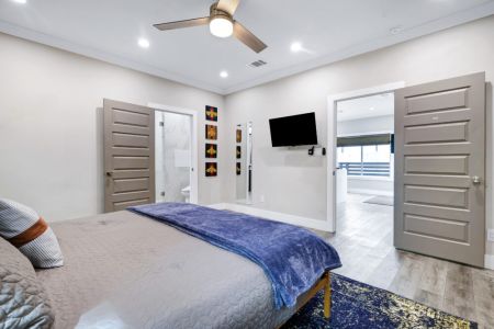 • Sixth bedroom: Second floor, king-sized bed, queen-sized sleeper sofa, smart TV, bedside table + lamp, full-length mirror, walk-in closet + ensuite bathroom + direct access to covered balcony