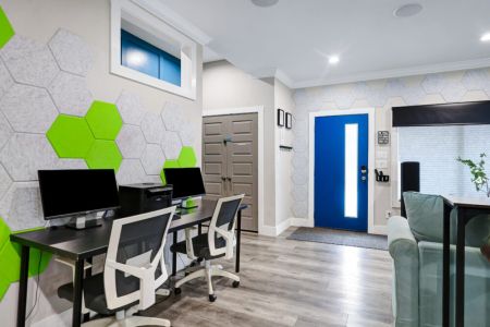 • High-speed Wi-Fi w/ speeds up to 400+ Mbps + large desktop computer w/ 2 ergonomic chairs + 2 monitors + printer