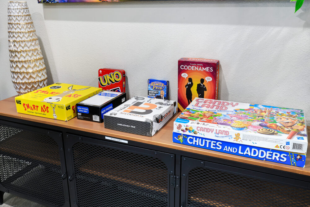 • Games galore; poker set + board games + giant Jenga + oversized chess, cornhole set