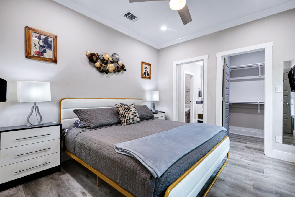 • Second bedroom: Second floor, king-sized bed, 1 twin-sized foldable bed, smart TV, bedside table + lamp, full-length mirror, walk-in closet + ensuite bathroom