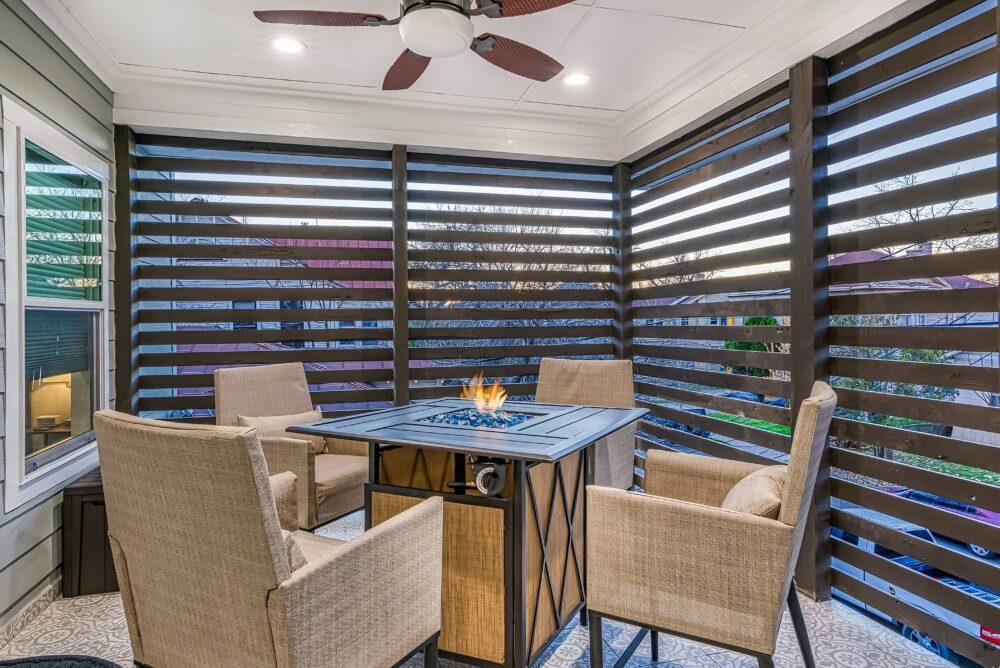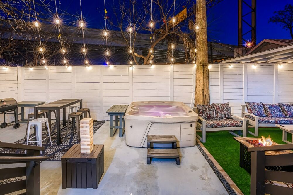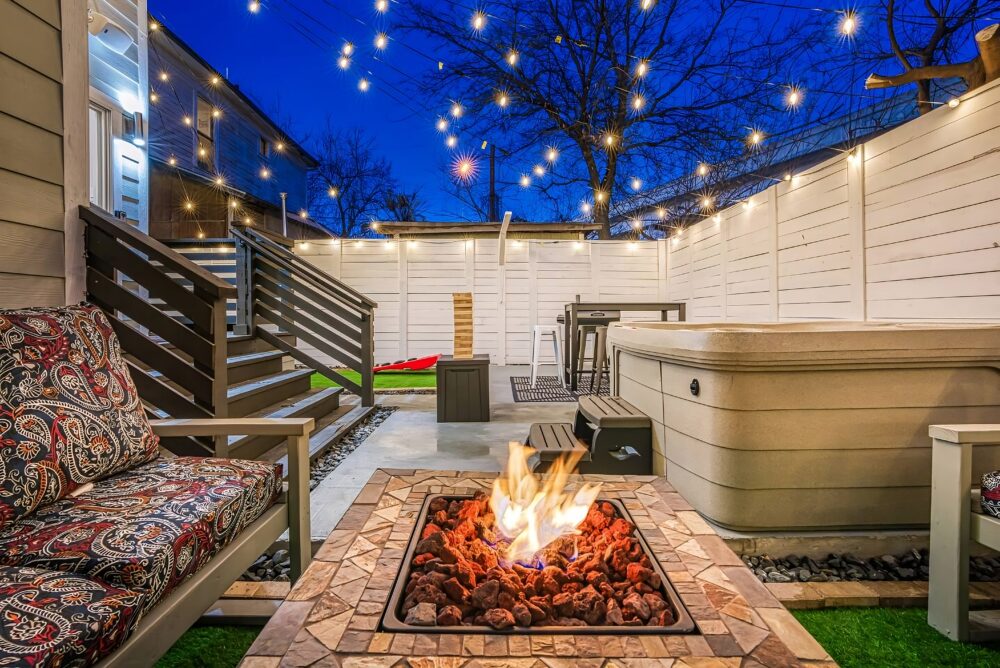 • Private backyard w/ electric pellet smoker + gas fire pit + patio seating + table and chairs